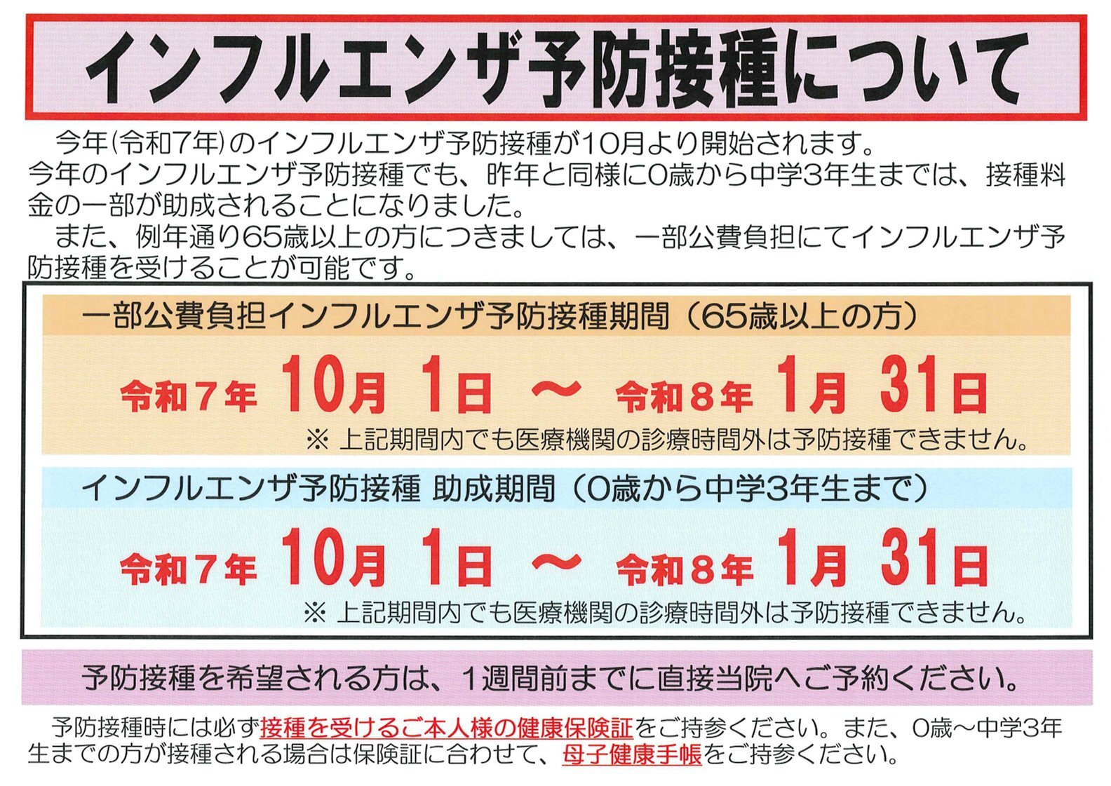 令和7年のインフルエンザ予防接種を10月より開始いたします。