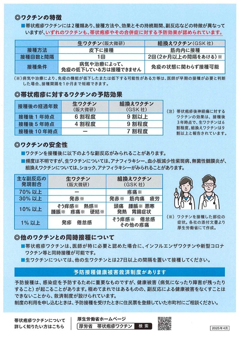 令和7年度から65歳以上の方などを対象に帯状疱疹ワクチンの定期接種を実施いたします。