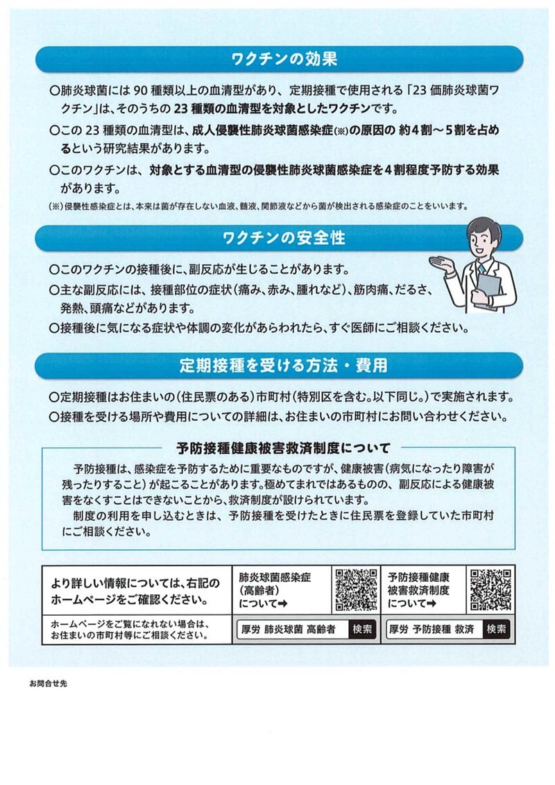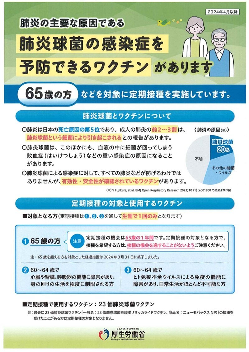 肺炎球菌ワクチンは生涯で1回のみとなり、定期接種の機会は65歳の1年間となりますので、接種の機会を逸することがないようにご注意ください。